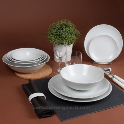 En toute simplicité et bon gout assuré. /La collection Léo est composée de deux tailles d'assiettes plates, une dessert, une creuse et de ses saladiers,coupelles. /Excellent rapport qualité,prix.